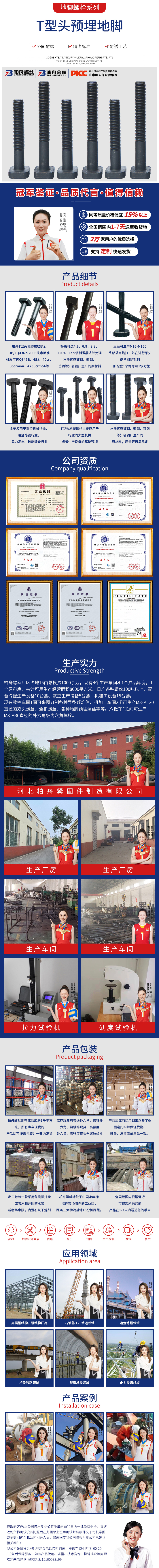 產品介紹:柏舟T型頭地腳螺栓執(zhí)行JB ZQ4362-2006技術標準,材質可選Q345B、45 、40cr、35crmoA、4235crmoA等,等級可選4 8、6 8、8 8、10 9、12 9調制煮黑法蘭處理。材質優(yōu)選邯鋼、邢鋼、首鋼等知名鋼廠生產的原材料,質量更可靠穩(wěn)定。直徑可生產M16-M160,頭部采用熱打工藝在進行平頭倒角剔除毛刺,一般配套1個螺母和1塊方墊。應用于重型機械行業(yè)、冶金煉鋼行業(yè)、風力發(fā)電、核能裝備行業(yè)。